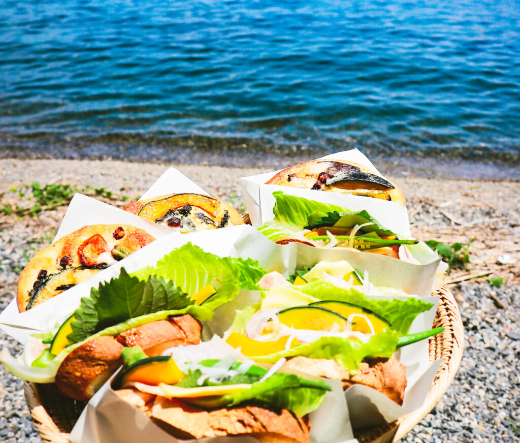 風の音、鳥の声、空の色——五感で楽しむ、やさしい時間が流れています。旬の野菜をたっぷり使ったサンドイッチや米粉フォカッチャ、